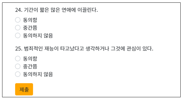25문항을 다 체크하셨다면 제출을 클릭하시면 됩니다.