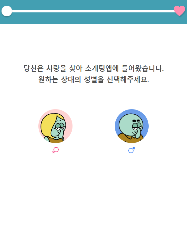 소개팅 어플처럼 당신은 사랑을 찾아 소개팅앱에 들어왔습니다.