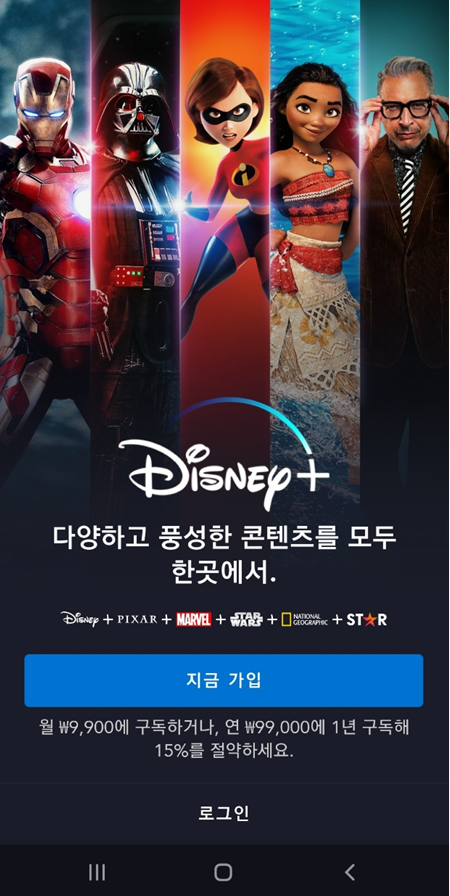디즈니+ 어플을 설치 하신 후 어플을 실행하시면 위의 그림처럼