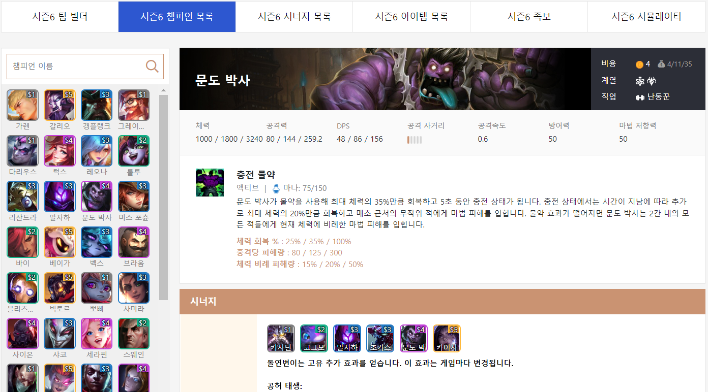 문도박사의 비용과 계열, 직업, 정보와 시너지와 챔피언에 해당되는 추천 아이템까지 자세하게 나와있습니다.