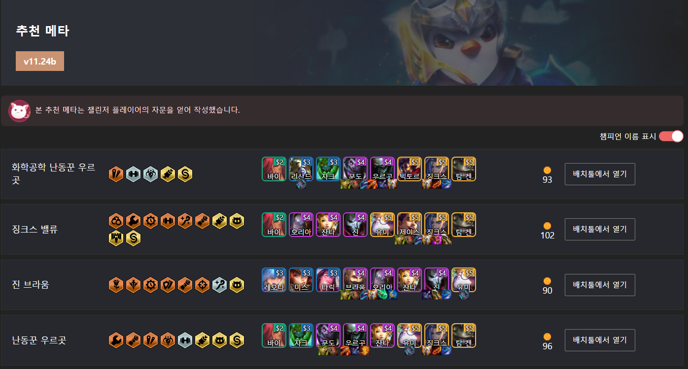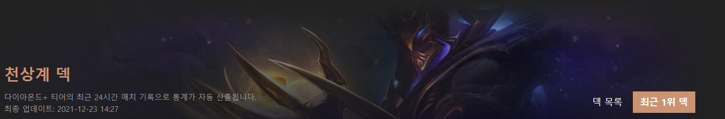 위에서 챌린저 플레이어가 사용하는 추천 메타 덱을 보셔도 좋지만 다이아몬드 티어 이상의 사람들이 사용하며, 통계를 낸 것이기 때문에 천상계 덱을 보시는 것도 추천해 드립니다. 덱을 만들어 가는 것은 자기 자신이기 때문에 참고해서 롤토체스를 하시면 좋을 것 같습니다.