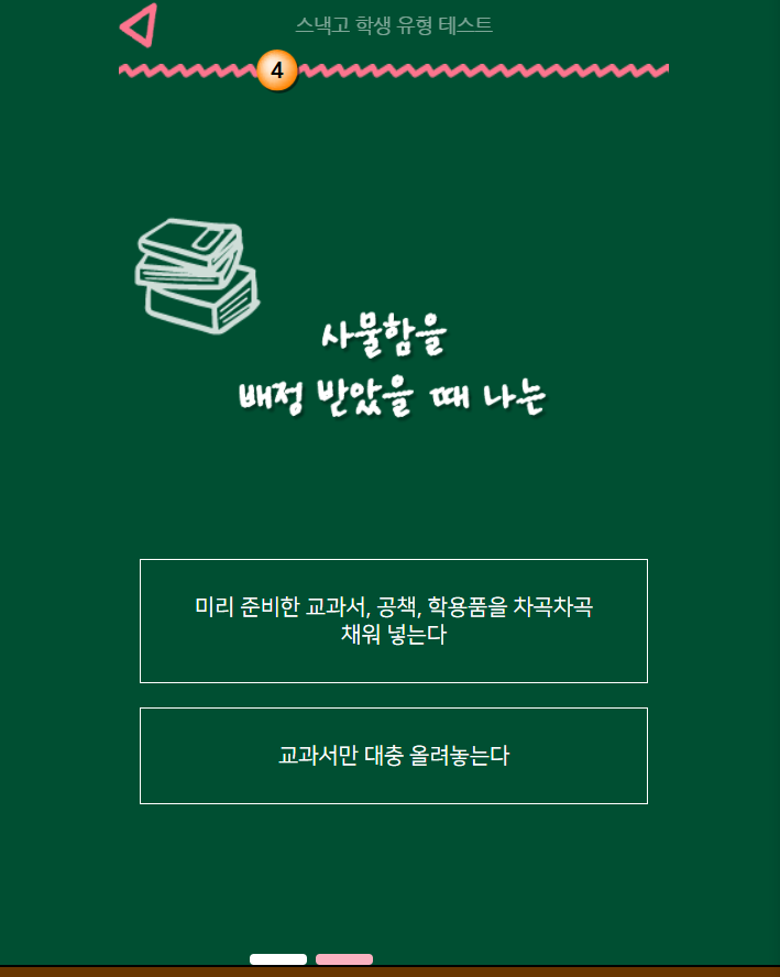 지금부터 전학와서 생긴일 '스낵고 학생 유형 테스트'를 시작해 보겠습니다.