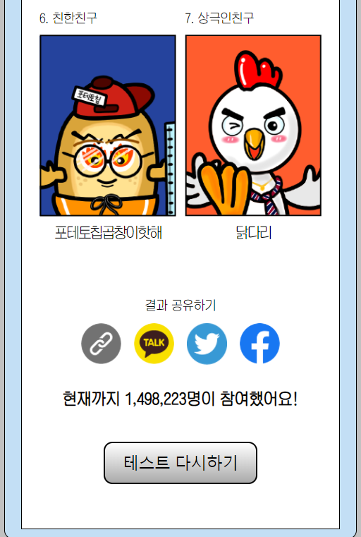 결과를 친구들에게 공유를 하거나 재미삼아 한 번 해보라고 추천을 해 줄 수 있습니다.