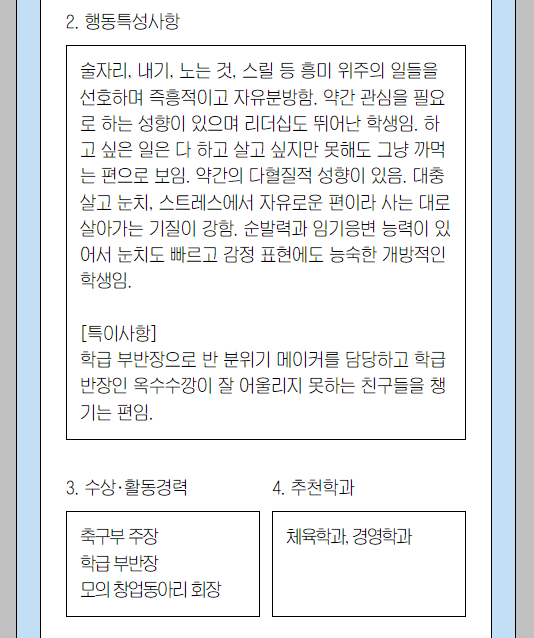 그래서 스낵(간식) 고등학교에서의 생활기록부에 나오는 학생 유형별로 알아볼 수 있는 심리 테스트를 하는 것입니다.