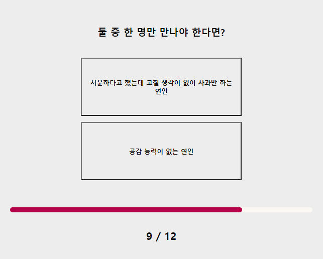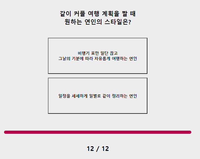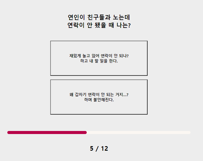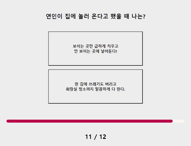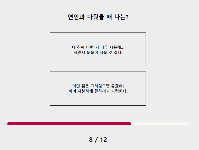 12번까지 문제를 다 체크하셨다면 결과를 알아보실 수 있습니다.
