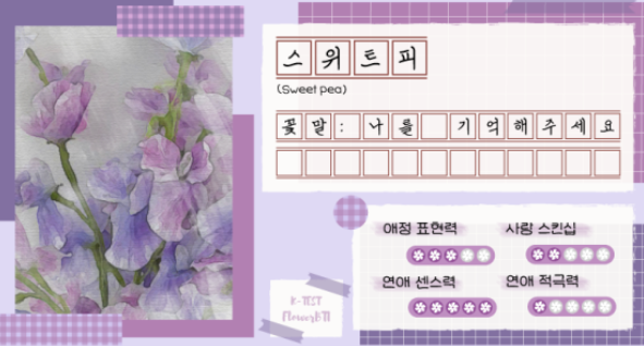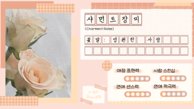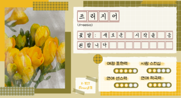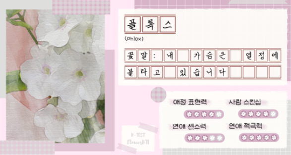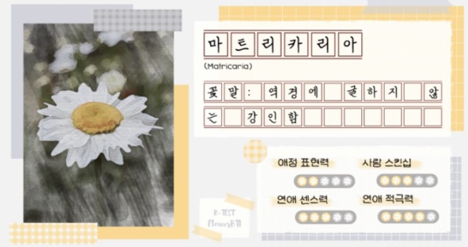 MBTI를 기반으로 하여 나에게 맞는 꽃과 꽃말, 성격, 연애에 대한 테스트로 하여 결과를 알려주는데요.