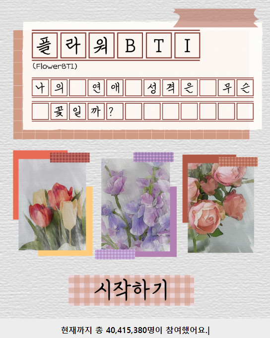 위에 사진에 있듯이 '시작하기'를 클릭하시면 플라워 BTI 테스트를 실시하실 수 있습니다.