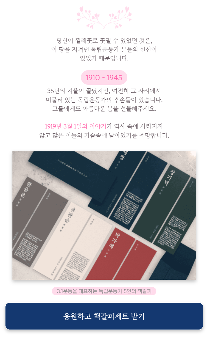 응원하고 3.1운동을 대표하는 독립운동가 5인의 책갈피세트을 받아가실 수 있습니다.