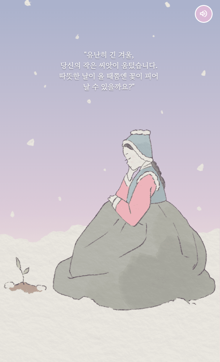 "유난히 긴 겨울, 당신의 작은 씨앗이 움텄습니다. 따뜻한 날이 올 때쯤엔 꽃이 피어 날 수 있을까요?"