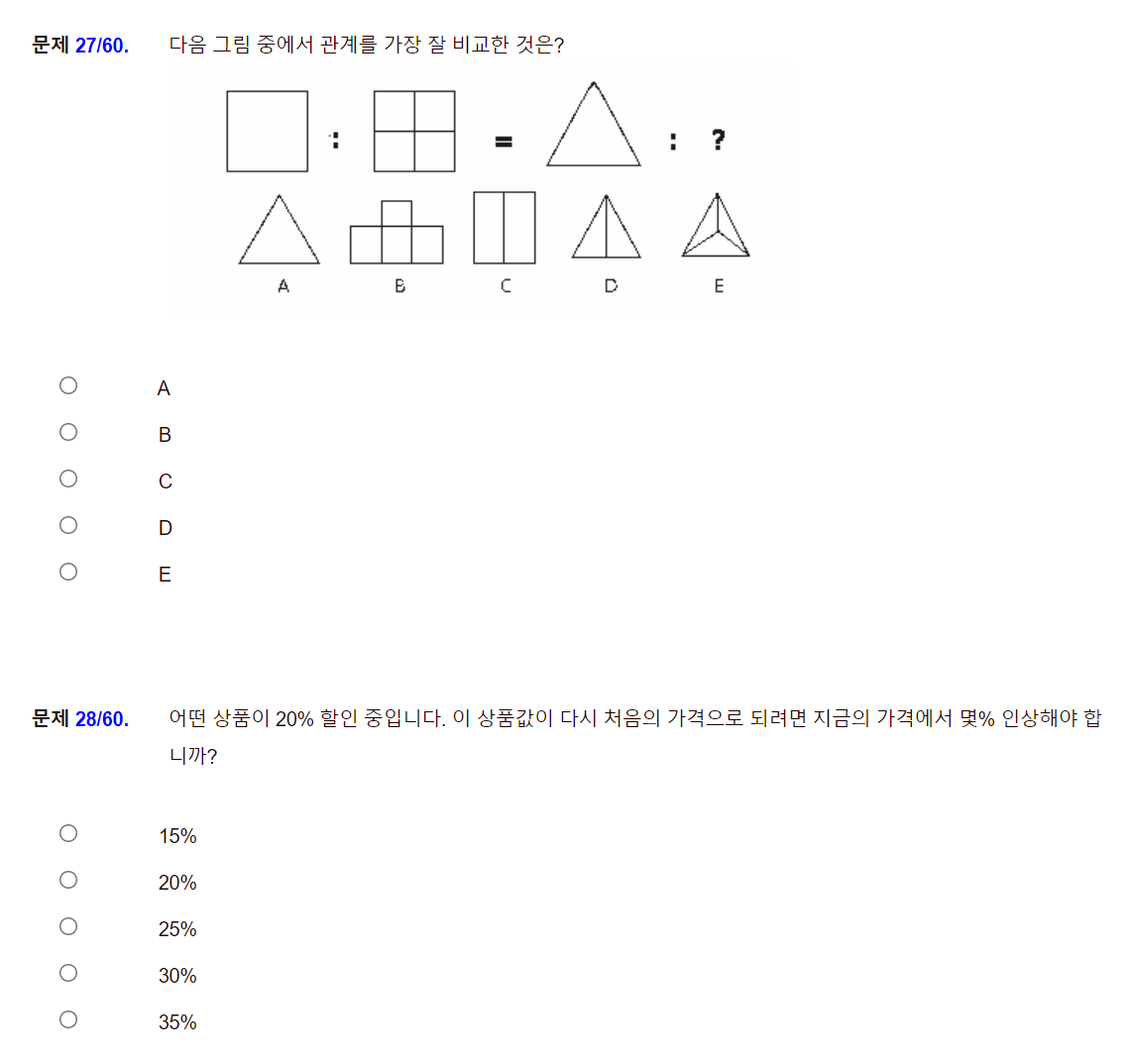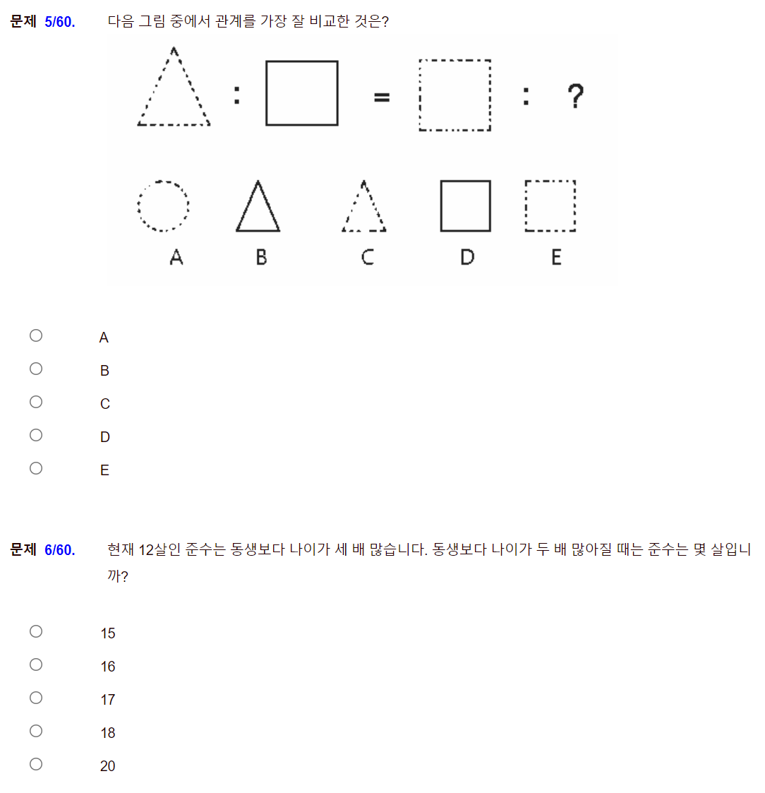 이 테스트는 수리/언어/도형 IQ(아이큐) 테스트이며, 제한 시간은 45분이며, 문항 수는 60문제라고 합니다.