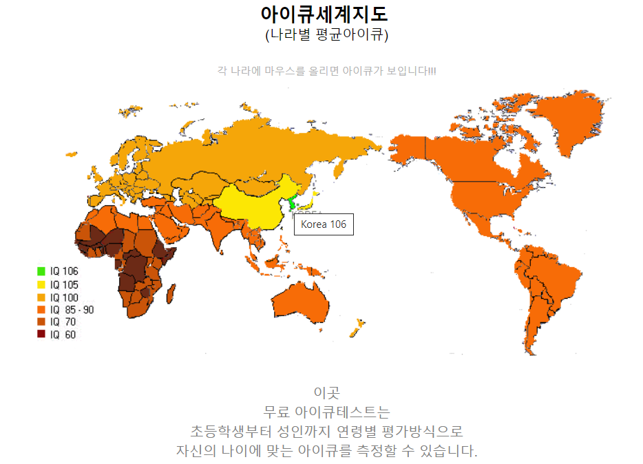 저는 초록색으로 보이는 우리나라에 마우스 스크롤을 올렸는데요. Korea IQ(아이큐)는 106으로 나왔습니다.