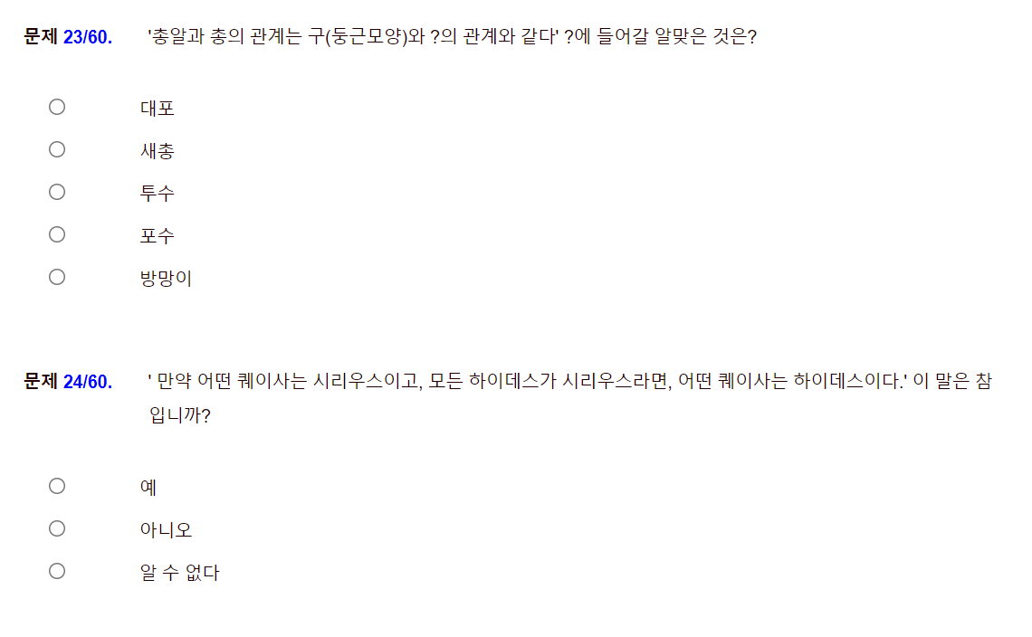 - 45분 안에 60문제를 다 풀어야 하며, 시간을 초과하면 안됩니다. 정확한 시간을 지켜야만 정확한 아이큐를 측정할 수 있습니다.