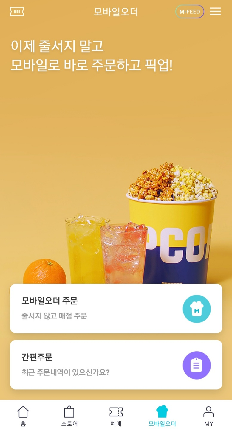 메가박스 어플을 통해서 모바일 오더 주문을 하여 줄서지 않고 매점 주문을 하실 수 있습니다.