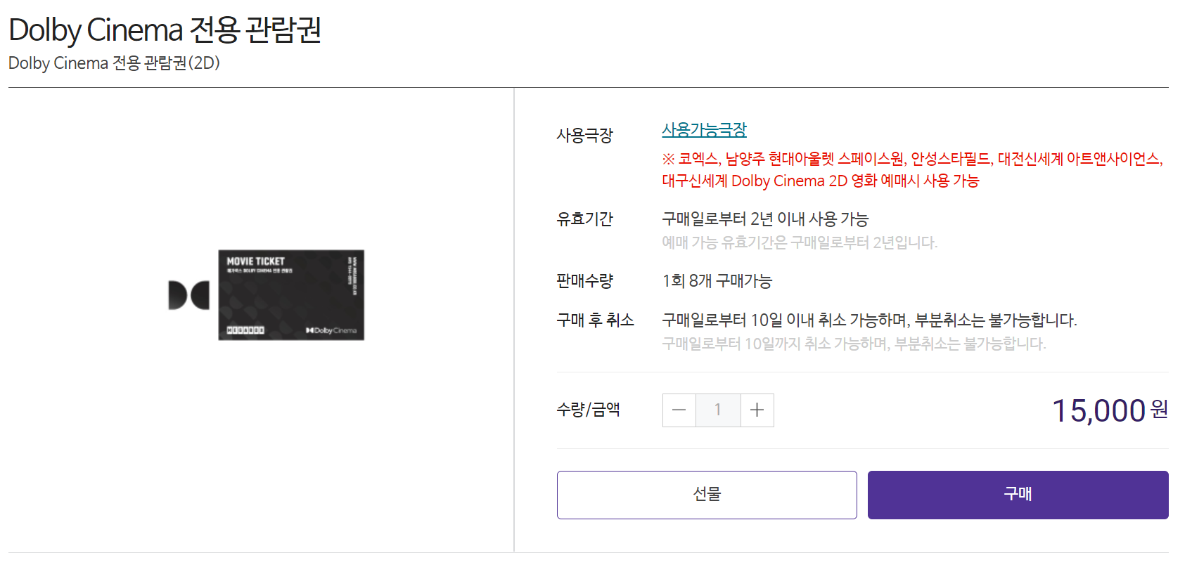 4. Dolby Cinema 전용 관람권(2D) - 가격 15,000원