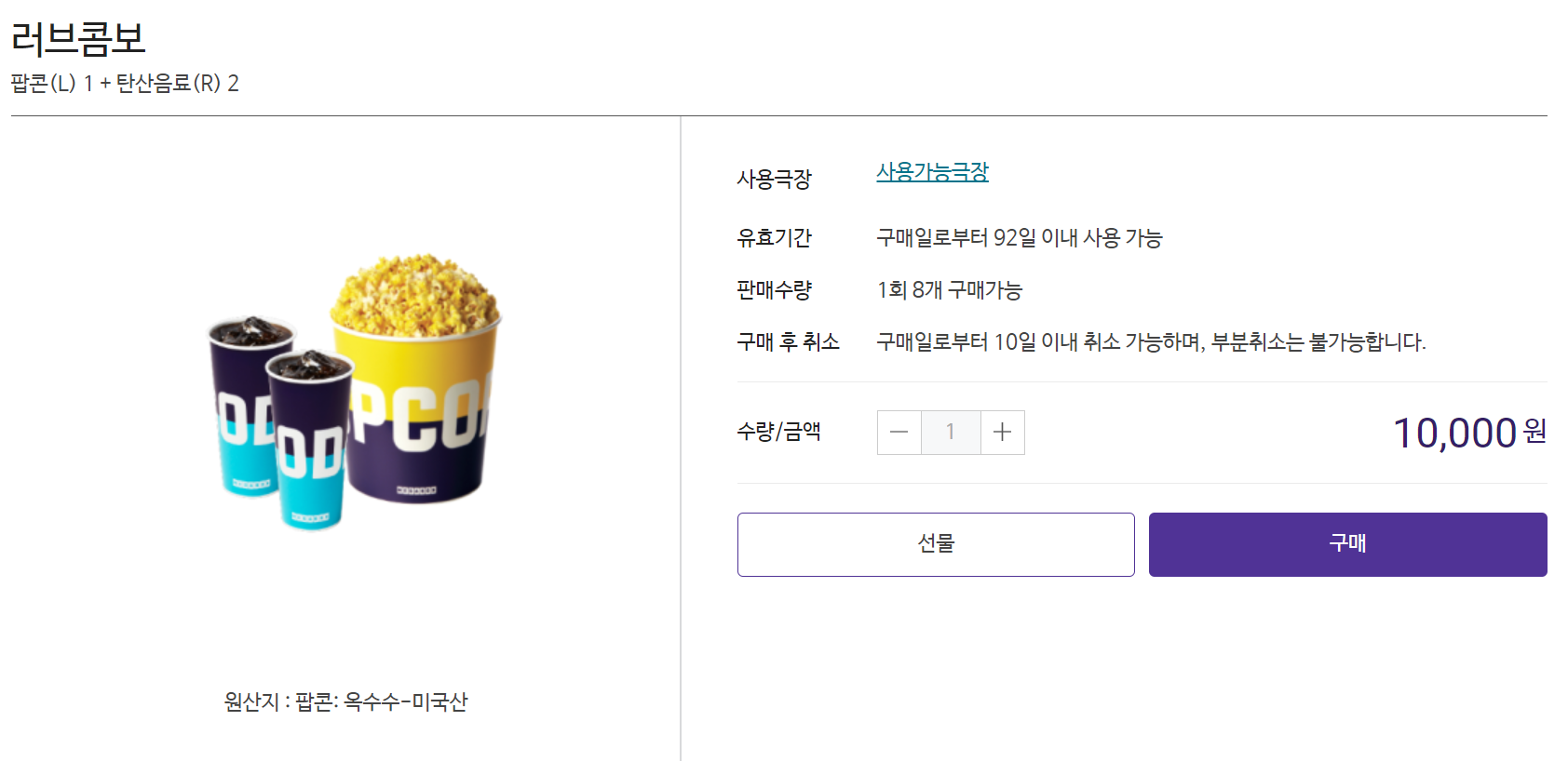 1. 러브 콤보 - 가격은 10,000원이며, 팝콘(L) 1개 + 탄산음료(R) 2개이며, 팝콘과 탄산음료 종류는 선택하실 수 있습니다.