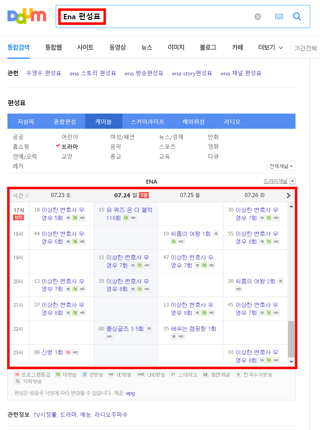 위의 그림처럼 검색어 창에 ENA 채널 편성표를 검색하시면 바로 알아보실 수 있으며, ENA 채널 홈페이지에서도 확인이 가능합니다.