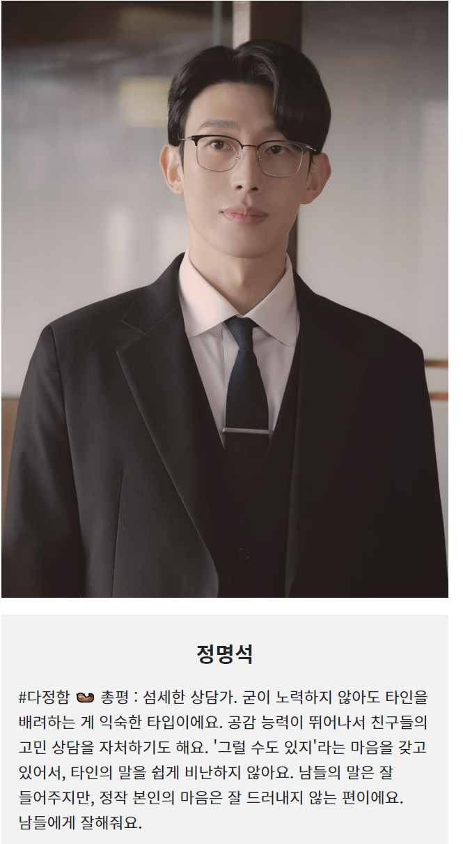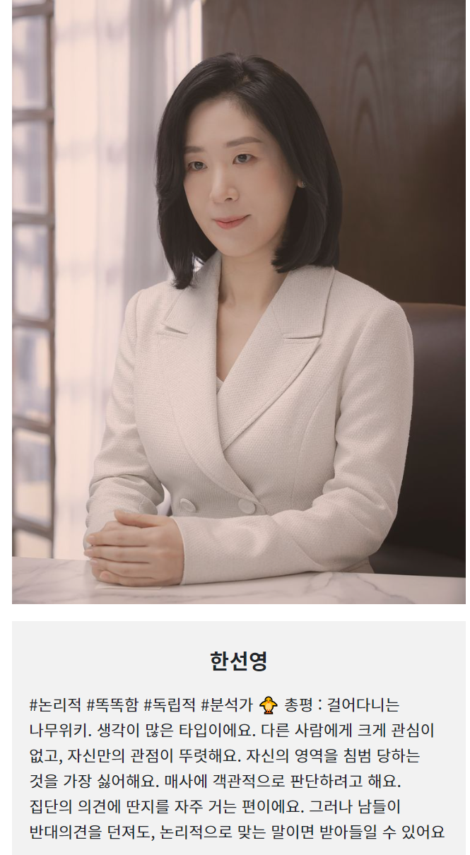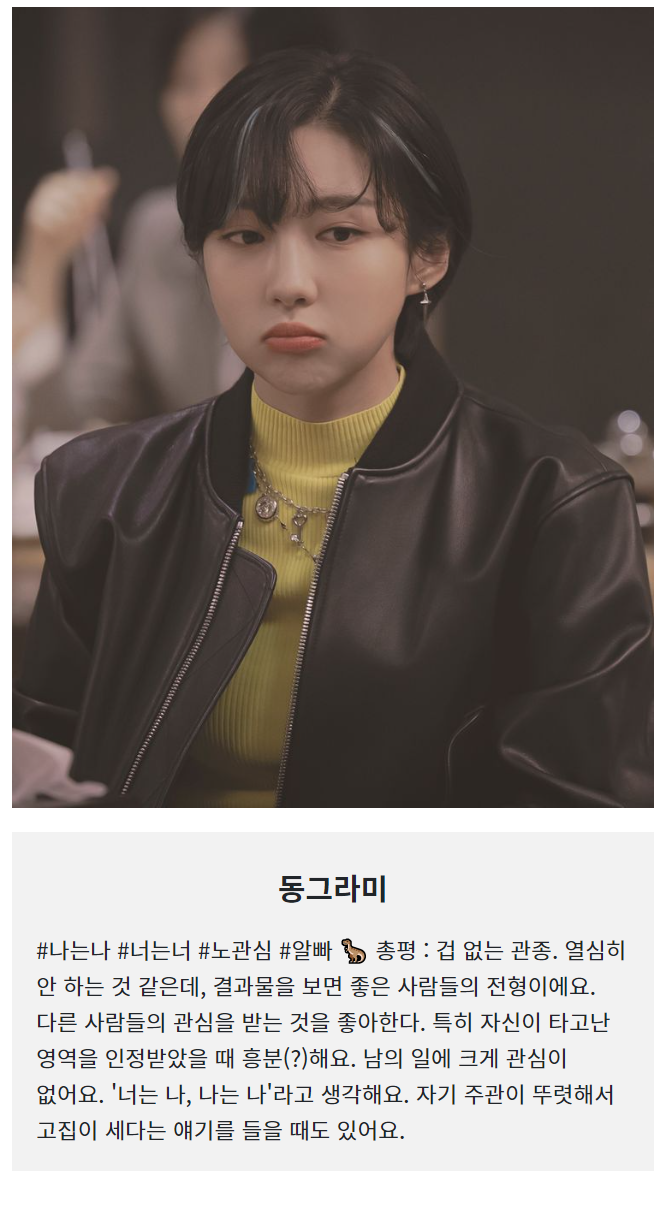 사실 그 누구보다 상황을 읽는 눈치가 빠르며, 자기 의견을 내세우기보단, 상황에 맞게 남들에게 잘 맞춰주는 편입니다.