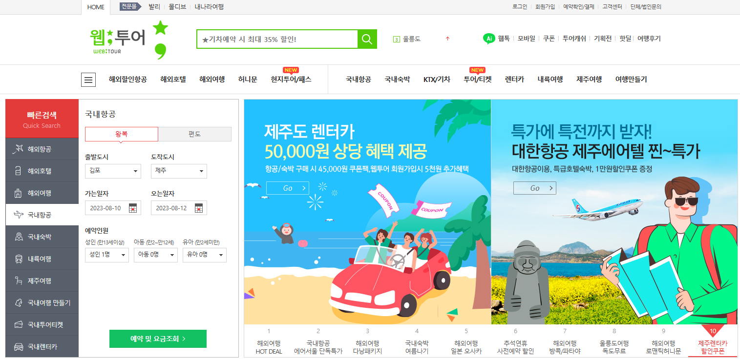 웹투어 공식 홈페이지는 항공권, 국내 숙박, 국내여행, 울릉도 여행, KTX예약, 기차예약, 호텔예약, 제주도항공권, 제주렌트카 등 제공됩니다.