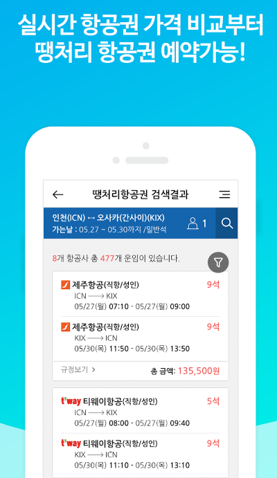 국내 9개의 항공사 실시간 가격 비교를 하실 수 있어 한 눈에 보기 쉽습니다. 제주도 여행을 계획, 일정을 있으신 분들이라면 제주항공권 실시간 최저가 어플을 이용해보시길 바랍니다.