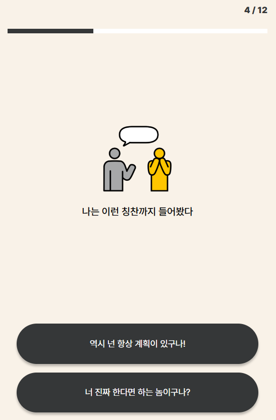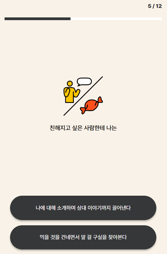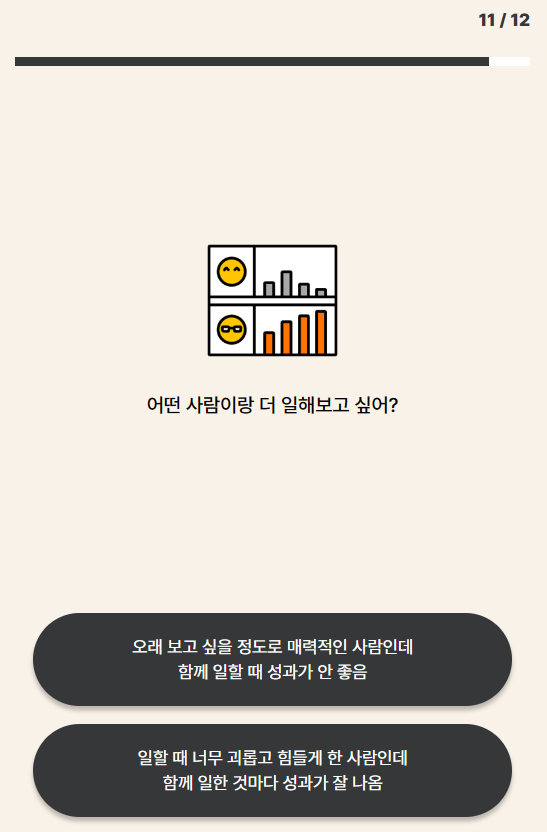 이 테스트는 MBTI 성격 유형 테스트와 비슷하게 12문항에 답변하면 결과 16가지의 유형을 알아보실 수 있습니다.