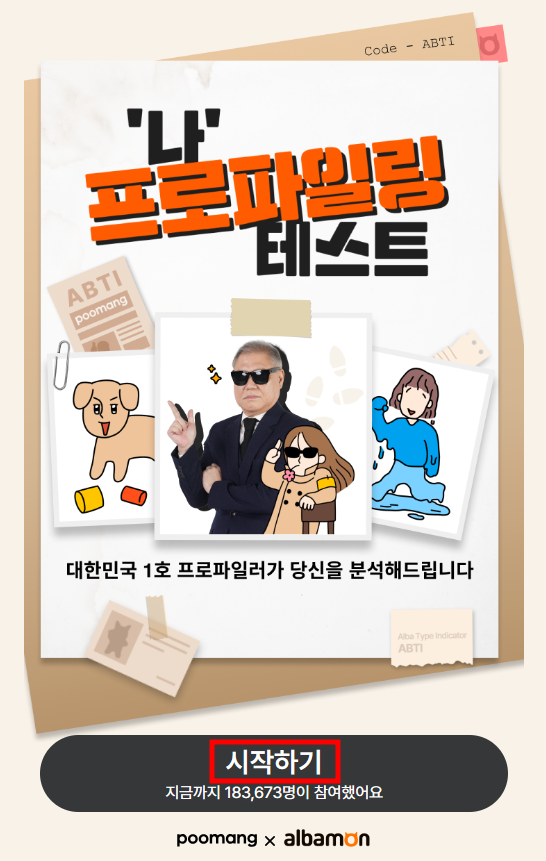 ABTI 테스트는 알바몬과 자아탐구 플랫폼 푸망이 협업해서 만든 테스트이며, 국내 최초 알바 심리 테스트입니다. 권일용 교수님을 모델로 발탁하여 수사 경험과 프로파일링 기법을 활용하여 테스트를 하는데 흥미롭고 재미있게 알바 추천을 받을 수 있게 도와준다고 합니다.