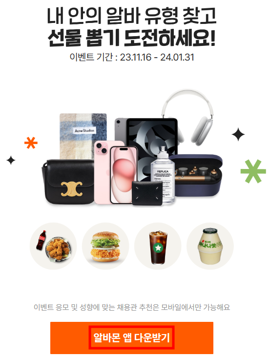 국내 최초 알바 심리테스트는 알바몬 공식 홈페이지에서 테스트를 할 수 있으며, PC(컴퓨터), 모바일, 노트북, 태블릿 등에서 간편하게 실시할 수 있습니다. (알바 심리테스트 결과 유형을 찾고 선물 뽑기 이벤트 23.11.16~24.01.31)