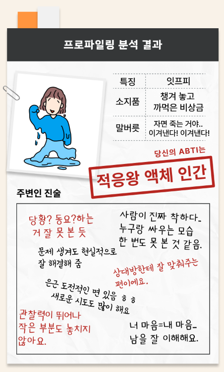국내 최초 알바 심리테스트 ABTI 결과는 '적응왕 액체 인간'이 나왔습니다.
