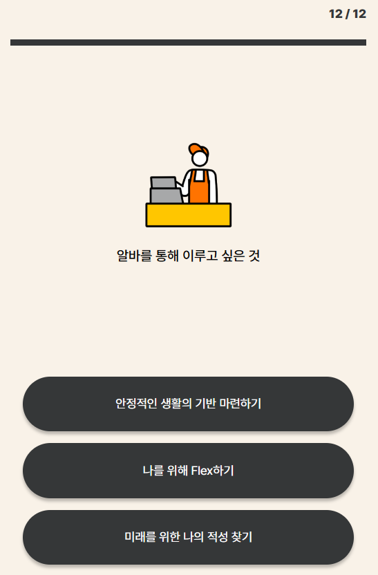 국내 최초 알바 심리테스트 질문(문항) 수는 총 12가지이며, 테스트 소요시간은 약 3~4분 정도 길립니다. 12개의 문항을 보시면서 위의 링크를 통해 테스트를 하시면 되겠습니다.